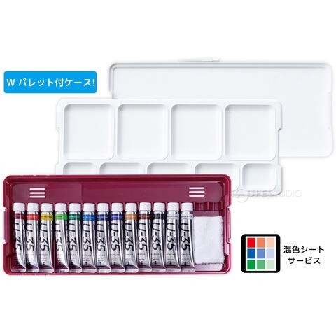 | セット内容 | 12色20mlチューブ各1本+ホワイト20mlチューブ1本 Wパレット付PPケース、ミニタオル付 |