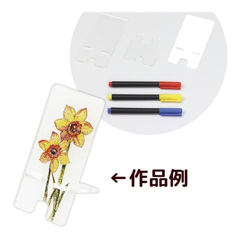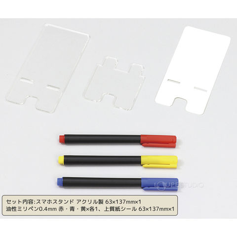 | セット内容 | スマホスタンド アクリル製 63×137mm×1 油性ミリペン0.4mm 赤・青・黄×各1 上質紙シール 63×137mm×1 |