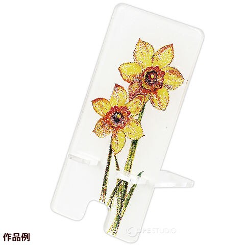 スマホスタンドにカラーペンで点描します。持ち帰って使え、実用的な教材です。