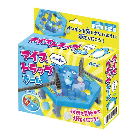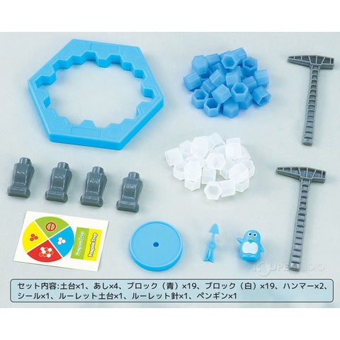 | セット内容 | 土台×1、あし×4、ブロック(青)×19、ブロック(白)×19、ハンマー×2、シール×1、ルーレット土台×1、ルーレット針×1、ペンギン×1 |
