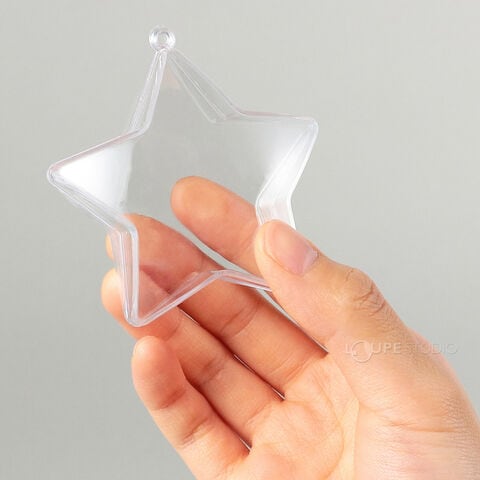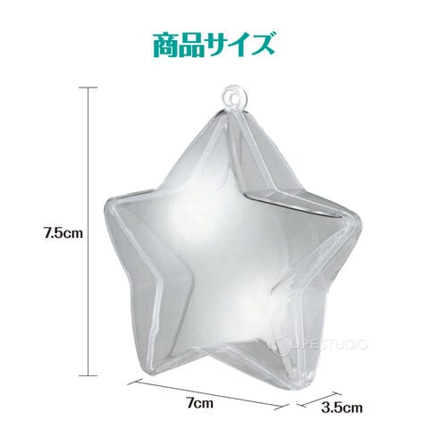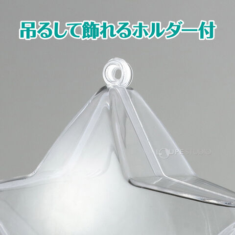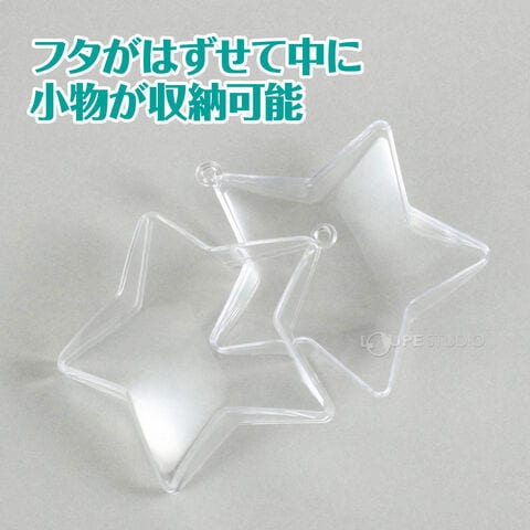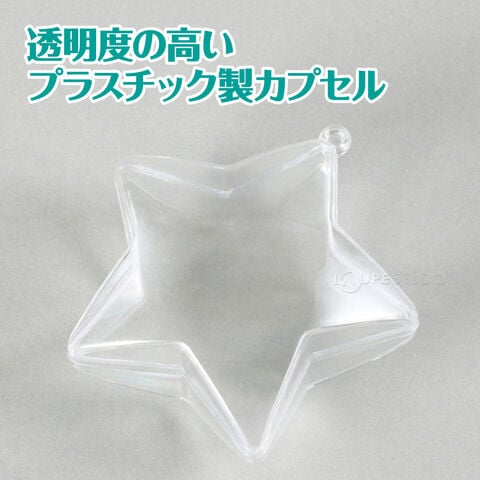 好きなマスコットやビーズ、ぬいぐるみなどを入れて飾ることができる透明カプセルです。かわいい星形です。ホルダー付きなのでチェーンなどを通すとキーホルダーにすることもできます。クリスマスツリーなどの飾り付けにも最適です。