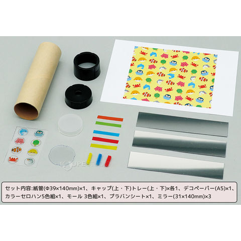| セット内容 | 紙管(Φ39×140mm)×1、キャップ(上・下)トレー(上・下)×各1、デコペーパー(A5)×1、カラーセロハン5色組×1、モール 3色組×1、プラバンシート×1、ミラー(31×140mm)×3 |