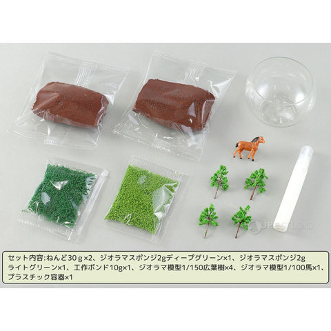 | セット内容 | ねんど30g×2、ジオラマスポンジ2gディープグリーン×1、ジオラマスポンジ2gライトグリーン×1、工作ボンド10g×1、ジオラマ模型1/150広葉樹×4、ジオラマ模型1/100馬×1、プラスチック容器×1 |