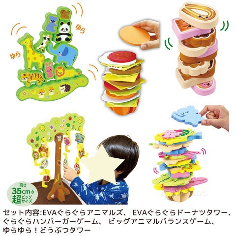| セット内容 | EVAぐらぐらアニマルズ、 EVAぐらぐらドーナツタワー、ぐらぐらハンバーガーゲーム、 ビッグアニマルバランスゲーム、 ゆらゆら!どうぶつタワー |
