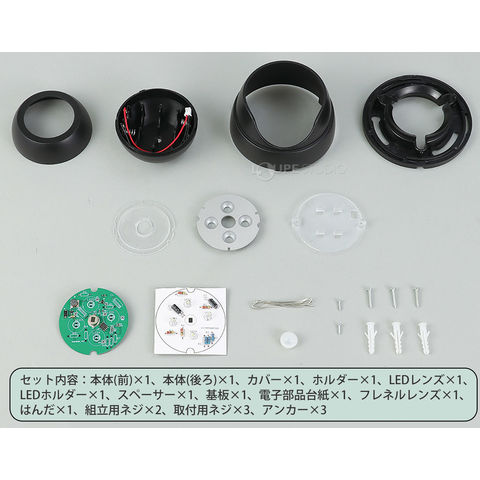 | セット内容 | 本体(前)×1、本体(後ろ)×1、カバー×1、ホルダー×1、LEDレンズ×1、LEDホルダー×1、スペーサー×1、基板×1、電子部品台紙×1、フレネルレンズ×1、はんだ×1、組立用ネジ×2、取付用ネジ×3、アンカー×3 |