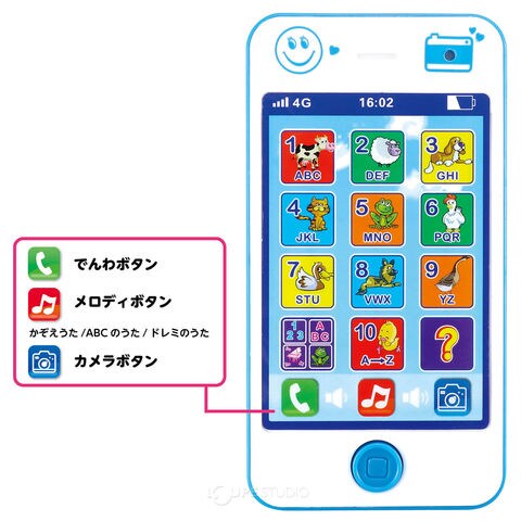 カメラやクイズなどいろいろなボタンに連動した機能があるので、たくさんの遊び方ができるスマートフォン型のオモチャ