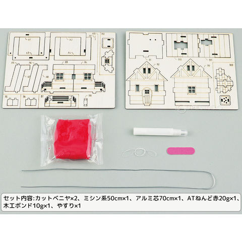 | セット内容 | カットベニヤ×2、ミシン系50cm×1、アルミ芯70cm×1、ATねんど赤20g×1、木工ボンド10g×1、やすり×1 |