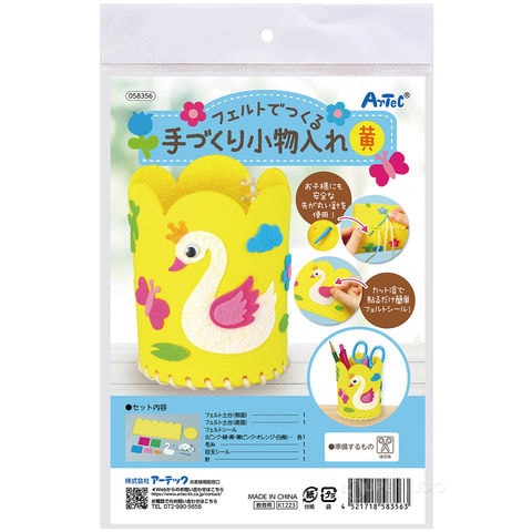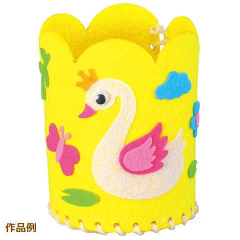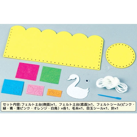 | セット内容 | フェルト土台(側面)×1、フェルト土台(底面)×1、フェルトシール(ピンク・緑・青・薄ピンク・オレンジ・白鳥)×各1、毛糸×1、目玉シール×1、針×1 |