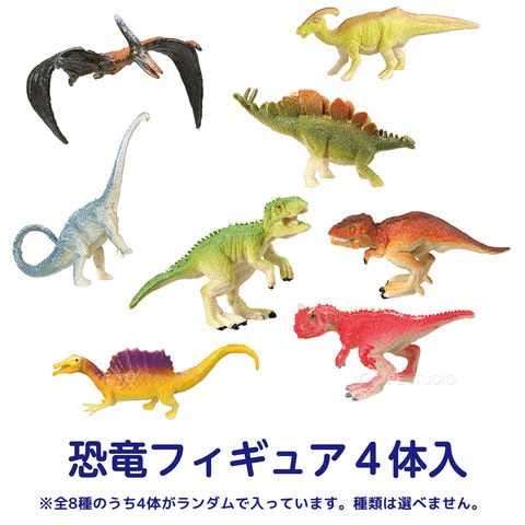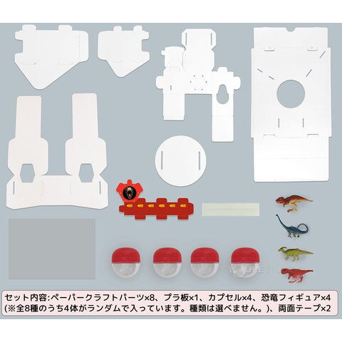 | セット内容 | ペーパークラフトパーツ×8、プラ板×1、カプセル×4、恐竜フィギュア×4(※全8種のうち4体がランダムで入っています。種類は選べません。)、両面テープ×2 |