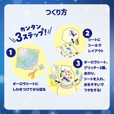 | セット内容 | スノードームボトル、防水シート、デザインシート、海の生き物シール、ホログラムグリッター(星)、オーロラフィルム |