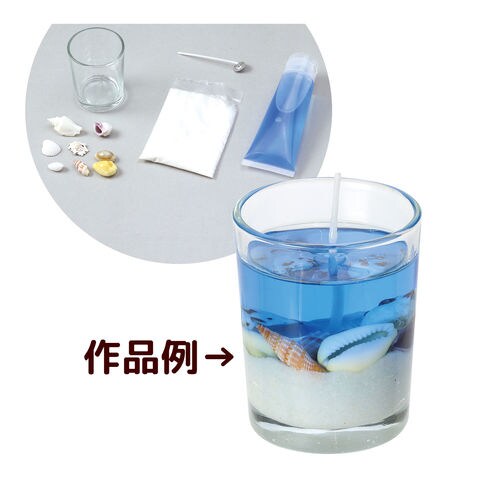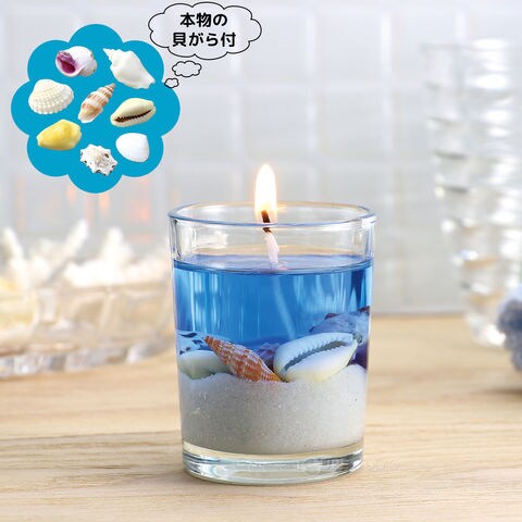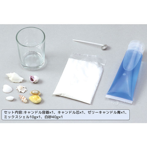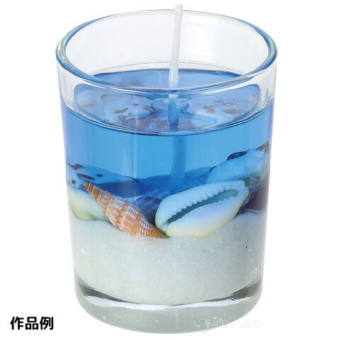 | セット内容 | キャンドル容器×1、キャンドル芯×1、ゼリーキャンドル青×1、ミックスシェル10g×1、白砂40g×1 |