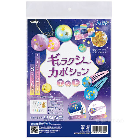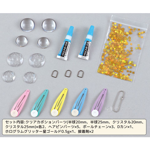 | セット内容 | クリアカボションパーツ(半球20mm、半球25mm、クリスタル20mm、クリスタル25mm)×各2、ヘアピンパーツ×5、ボールチェーン×3、Dカン×1、ホログラムグリッター星ゴールド0.5g×1、接着剤×2 |