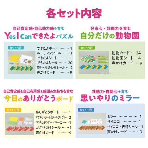| セット内容 | 「Yes I can できたよパズル」「自分だけの動物園」「今日のありがとうボード」「思いやりのミラー」各1セット、カラー表紙 |