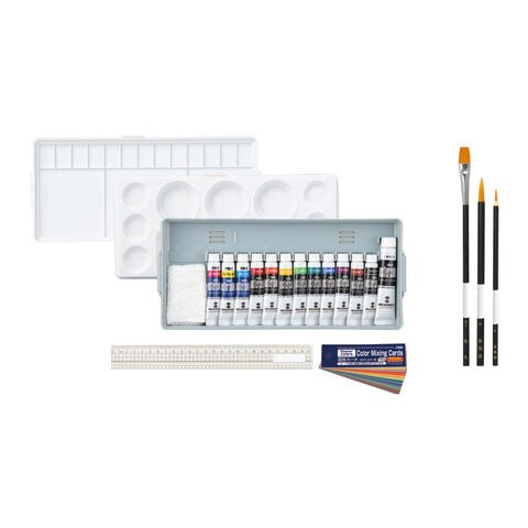 | セット内容 | ターナーポスターカラー三原色スタディーセット13色13本セット、ナイロン黒軸デザイン筆3本組(筆用名前シール付)、混色カードポスターカラー用120色、アクリル方眼定規溝付25cm、パレット2枚、ミニタオル付 |
