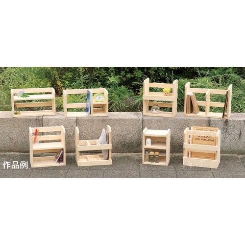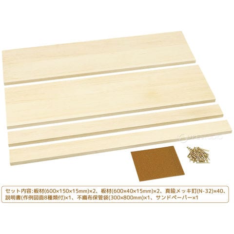 | セット内容 | 板材(600×150×15mm)×2、板材(600×40×15mm)×2、真鍮メッキ釘(N-32)×40、説明書(作例図面8種類付)×1、不織布保管袋(300×800mm)×1、サンドペーパー×1 |