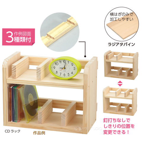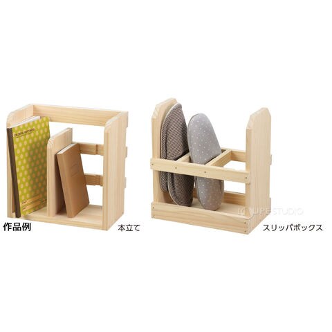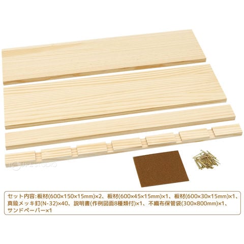 | セット内容 | 板材(600×150×15mm)×2、板材(600×45×15mm)×1、板材(600×30×15mm)×1、真鍮メッキ釘(N-32)×40、説明書(作例図面8種類付)×1、不織布保管袋(300×800mm)×1、サンドペーパー×1 |