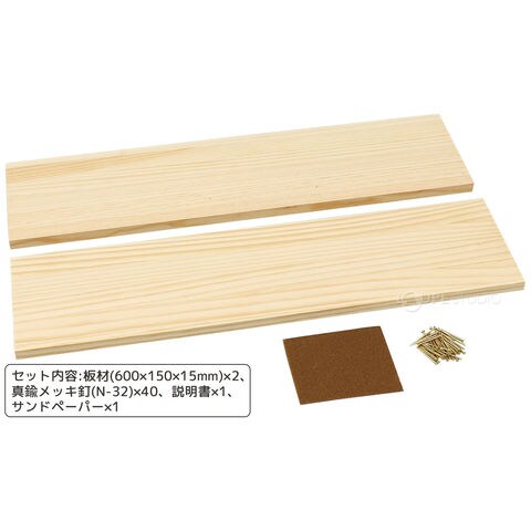 | セット内容 | 板材(600×150×15mm)×2、真鍮メッキ釘(N-32)×40、説明書×1、サンドペーパー×1 |