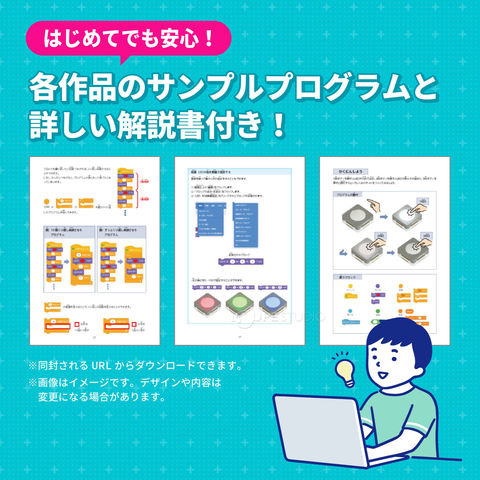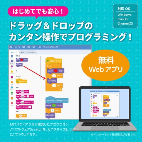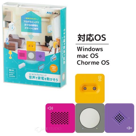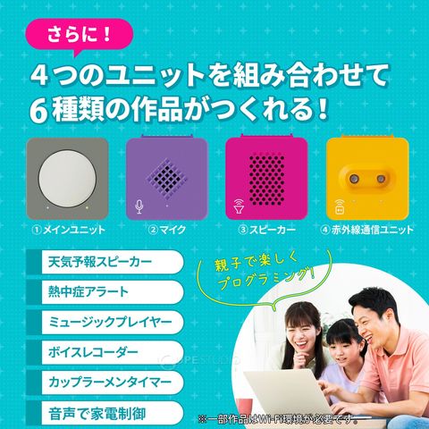 作品1「音声で家電を制御」、作品2「天気予報モニター」、作品3「熱中症警告システム」、作品4「ミュージックプレイヤー」、作品5「ボイスレコーダー」、作品6「カップラーメンタイマー」 ソフトウェアはドラッグ&ドロップの簡単操作。sratch(3.0)ベースの無料専用ソフトウェアです。