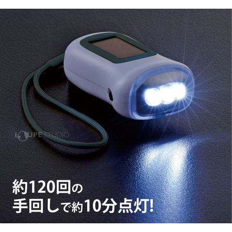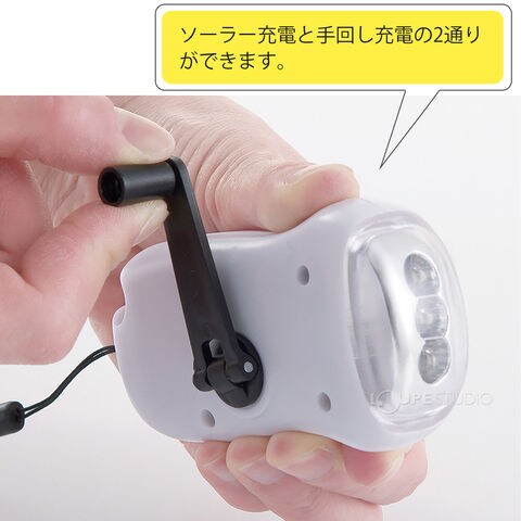 ソーラー充電と手回し充電の2通りができます。約1時間のソーラー充電で約15分点灯します。持ち運びやすいサイズなので、防災用品に!