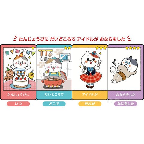 「いつ」「どこで」「だれが」「どうした」の4つ言葉を組み合わせておはなしをつくるカードゲームです。