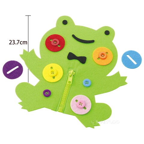 ボタン遊びとファスナー遊びができるかわいいカエルのフェルトです。