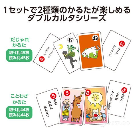 | セット内容 | だじゃれかるた(取り札×45、読み札×45、予備×6)×1、ことわざかるた(取り札×44、読み札×44)×1 |