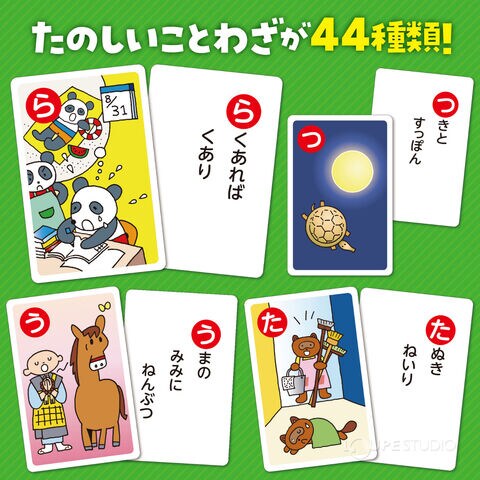 - 【ことわざかるた】楽しく遊びながらことわざを学べるかるたです。44種類のことわざを覚えることができます。かわいいイラストで、視覚的にも楽しくことわざを学べます。ことわざの説明も付いているため、意味をしっかりと理解できます。