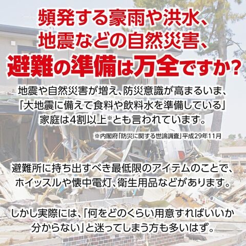 | 材質 | 大容量リュックレッド/ナイロン、5年保証・超防災用ウェットティッシュ/不織布・水・エタノール・グリセリン・メンソールエッセンス・メンソール・PEG-60水添ヒマシ油・塩化ベンザルコニウム・コロルヘキシングルコン酸塩、ATトイレストック1回用/高吸水性樹脂(SAP)・LLDPE、2WAYLEDライト17cm//PP・磁石、非常用アルミ防寒シート/PET、不織布スリッパ/不織布、不織布マスク/不織布、エマージェンシー3点セット/ポリエステル・綿・ポリスチレン、ポケットティッシュ/パルプ、エイドチーム2/塩ビ・綿・PP・不織布、非常用食器折り紙/炭酸カルシウム・高密度ポリエチレン、hokkaのカンパン/小麦粉(国内製造)・砂糖・ショートニング・胡麻・食塩・パン酵母、歯ブラシセット/ポリプロピレン・ナイロン・スチロール樹脂・精製水・グリセリン・ソルビトールなど、水のいらない泡なしシャンプーウェット手袋/レーヨン・ポリプロピレン、ポリ袋45L(10枚入り)黒/LLDPE、立体スポンジアイマスク/ポリエステル、持ち運びエアー枕/PVC、耳栓/PU・ポリエチレン、ATクッションブランケットピンク/ポリエステル、緊急用給水袋3Lマチ付/ナイロン・ポリエチレン、非常用アルミ防寒ポンチョ/PET、センサー付ヘッドライト/ABS |