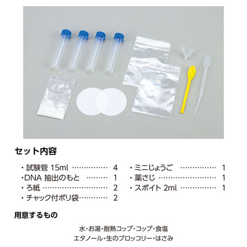 | セット内容 | 試験管15ml×4、スポイト2ml×1、薬さじ×1、チャック付ポリ袋×2、ろ紙×2、ミニジョウゴ×1、DNA抽出のもと(洗濯洗剤)×1 |