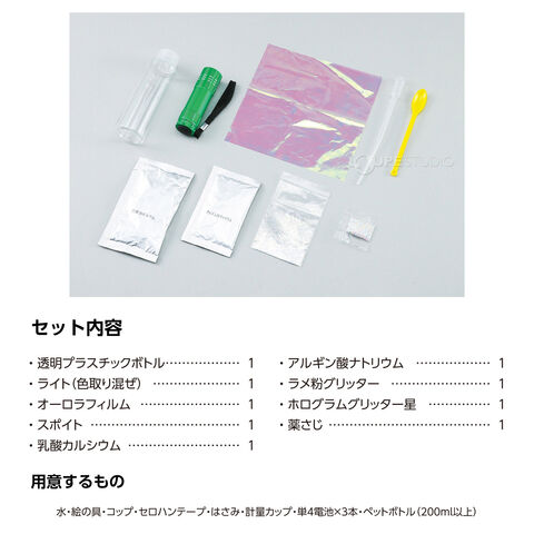 | セット内容 | 透明プラスチックボトル×1、ライト(色取り混ぜ)×1、オーロラフィルム×1、ホログラムグリッター星×1、ラメ粉グリッター×1、薬さじ×1、スポイト2ml×1、アルギン酸ナトリウム×1、乳酸カルシウム×1 |