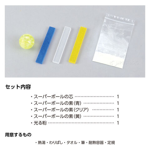 | セット内容 | スーパーボールの芯×1、スーパーボールの素(青・黄・クリア)×各1、蛍光粉×1 |