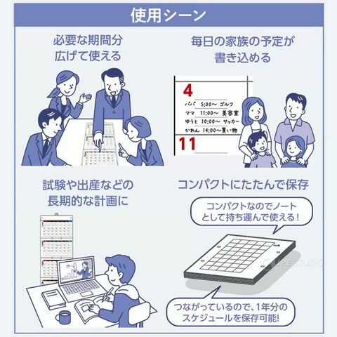単月~12ヵ月の必要な期間だけを広げて使える自由表示タイプで、予定の全体像が一目で把握できます。