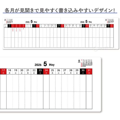 各月が見開きで見やすく、内容の確認もメモの書き込みもスムーズです。