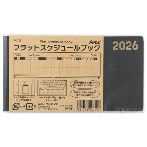 フラットスケジュールブック 見開きフラット 製本 2026年 携帯型 月間カレンダー 日本製 薄型 透明カバー付き