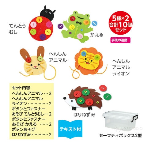 | 材質 | へんしんアニマル(うさぎ)/フェルト・ナイロン へんしんアニマル(ライオン)/フェルト・ナイロン ボタンとファスナーあそび (てんとうむし)/フェルト ボタンとファスナーあそび(かえる)/フェルト ボタンあそび(はりねずみ)/フェルト プラケース/PP |