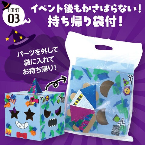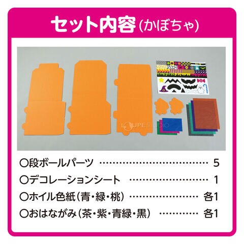 セット内容かぼちゃ/ダンボールパーツ×5、デコレーションシート×1、ホイル色紙(青、緑、桃)×1、おはながみ(茶、紫、青緑、黒)×1、持ち帰り用袋×1