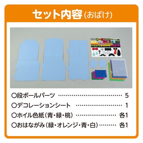 おばけ/ダンボールパーツ×5、デコレーションシート×1、ホイル色紙(青、緑、桃)×1、おはながみ(緑、オレンジ、青、白)×1、持ち帰り用袋×1