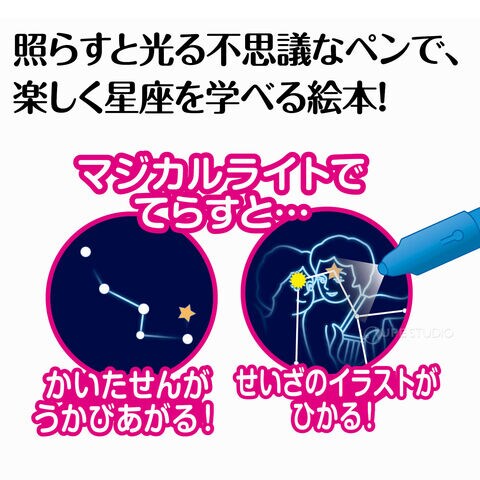 - 星の並びをなぞってペンで描いた線は、光を当てると浮かび上がる魔法のような仕掛け付きで、子どもたちの星空への興味を自然に引き出します。