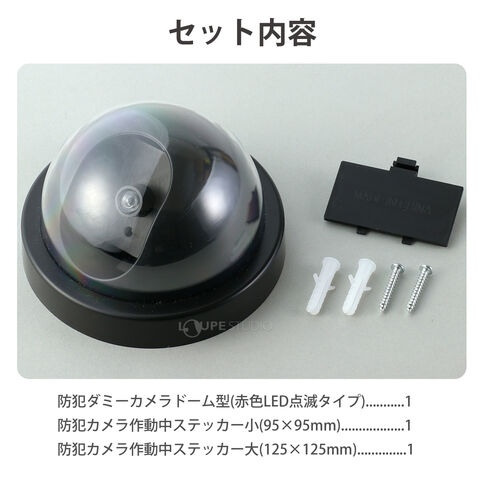 | セット内容 | 防犯ダミーカメラドーム型(赤色LED点滅タイプ゜)×1、防犯カメラ作動中ステッカー小(95×95mm)×1、防犯カメラ作動中ステッカー大(125×125mm)×1 |