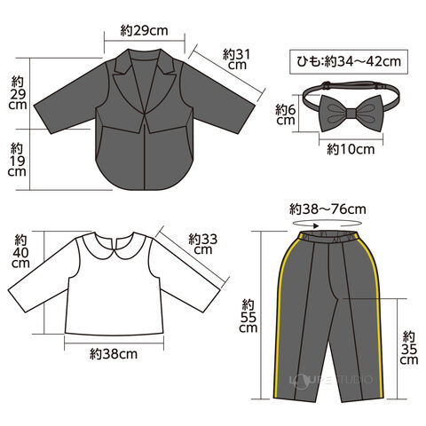 商品サイズブラウス(ソフトサテン長袖ブラウス C)/着丈 約400mm / 裾幅 約380mm / 腕の長さ 約330mm、パンツ(ソフトサテンテーパードパンツライン C)/ウエスト 約380~760mm / 総丈 約550mm / 股下 約350mm、ジャケット(ソフトサテンジャケット)/着丈 約480mm / 肩幅 約290mm / 腕の長さ 約310mm、蝶ネクタイ/リボン 約60×100mm / ひも(首まわり)約340~420mm