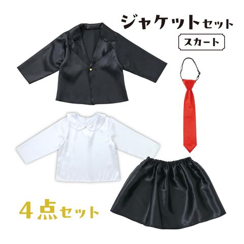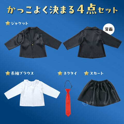 • ジャケット・ブラウス・スカート・ネクタイの4点セットで、簡単にかっこよく着用できます。
