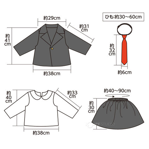 商品サイズブラウス(ソフトサテン長袖ブラウス C)/着丈 約400mm / 裾幅 約380mm / 腕の長さ 約330mm、スカート(ソフトサテンスカート)/ウエスト 約400~900mm / 丈 約300mm、ジャケット(ソフトサテンテーラードジャケット)/着丈 約410mm /身幅 約290mm / 袖丈 約310mm、ネクタイ/ネクタイ部分 320×60mm/ 首掛け紐/300mm~600mm(調整可能)