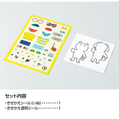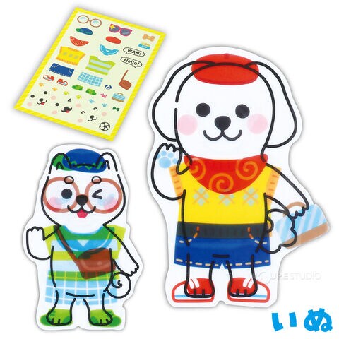かわいい犬のキャラクターを、透明シールで自由に着せかえできる楽しい工作キットです。