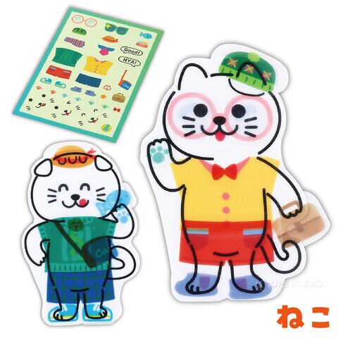 かわいい猫のキャラクターを、透明シールで自由に着せかえできる楽しい工作キットです。