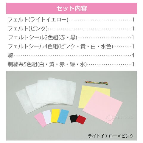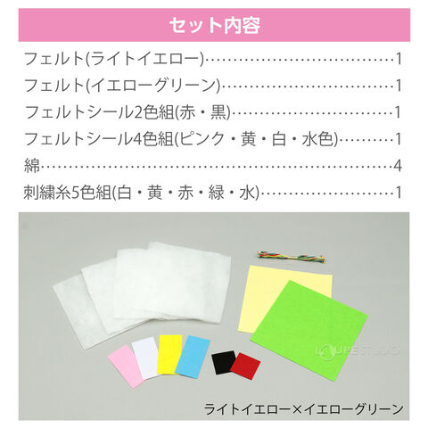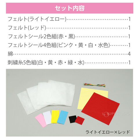 | セット内容 | フェルト×2、フェルトシール2色組(赤・黒)×1、フェルトシール4色組(ピンク・黄・白・水色)×1、綿×4、刺繍糸5色組(白・黄・赤・緑・水)×1 |