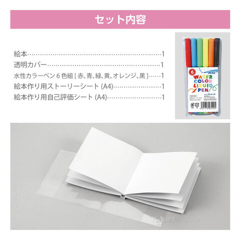 | セット内容 | 絵本本体×1、水性ペン6色セット×1、絵本作り用ストーリーシート(A4)×1、絵本作り用自己評価シート(A4)×1 |