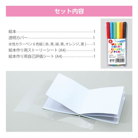 | セット内容 | 絵本本体×1、水性ペン6色セット×1、絵本作り用ストーリーシート(A4)×1、絵本作り用自己評価シート(A4)×1 |