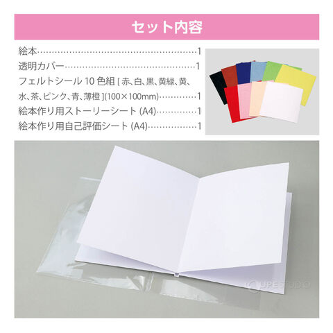 セット内容絵本本体×1、水性ペン6色セット×1、絵本作り用ストーリーシート(A4)×1、絵本作り用自己評価シート(A4)×1