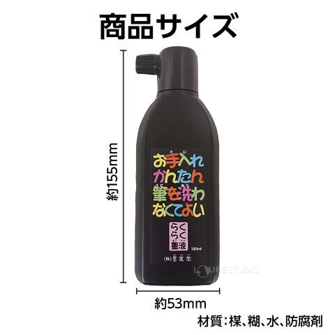 - 墨汁を使った後でも筆が固まりにくく、水洗いだけで簡単にほぐせる便利な墨液です。