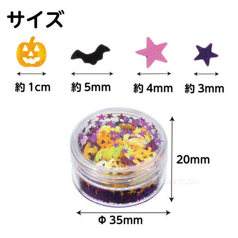 | 商品サイズ | 容量/約3g、カボチャ/約1cm、コウモリ/約5mm、星(小)/約3mm、星(大)/約4mm |